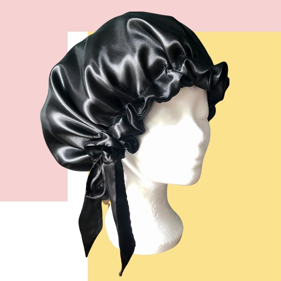 Handgemaakte luxe bonnet van satijn met lint om de bonnet vast te maken.
